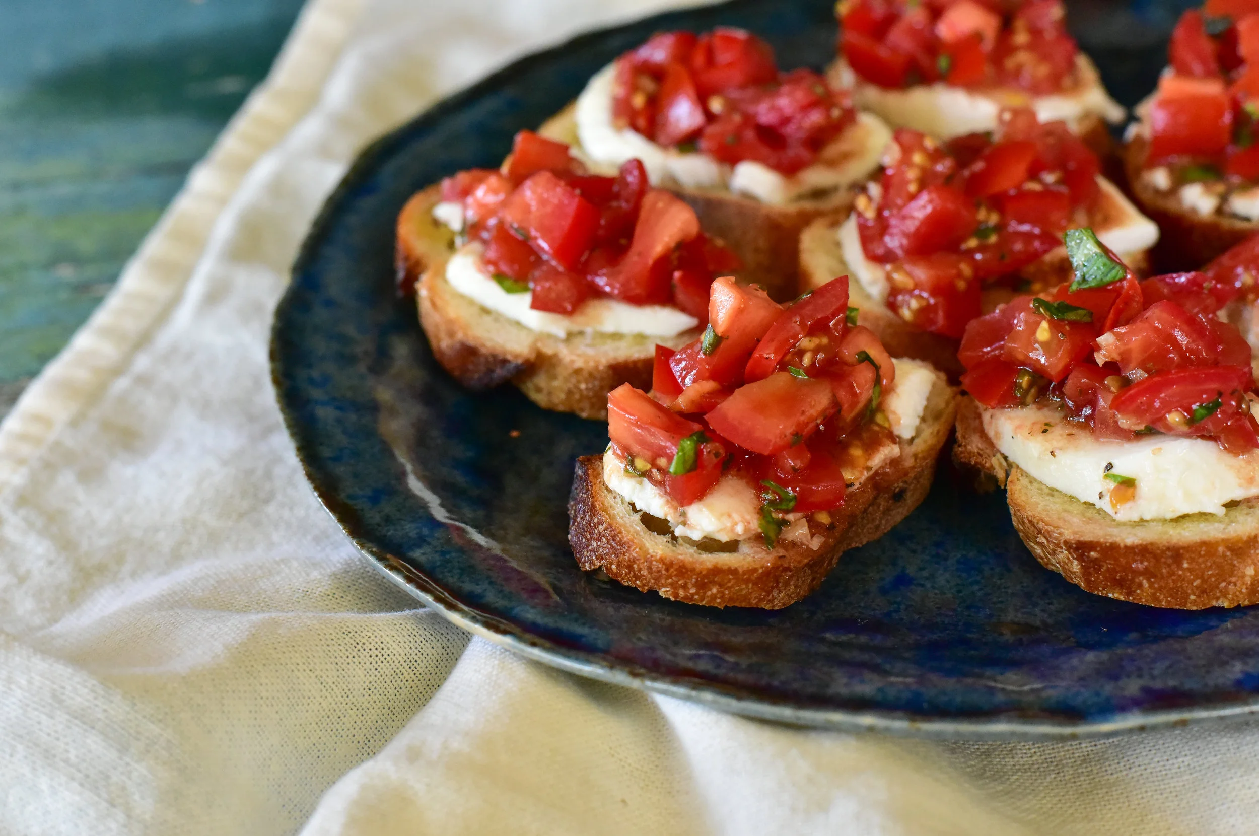 - To assemble, add one slice of mozzarella cheese to each baguette and top with one tablespoon of Tomato Basil Bruschetta